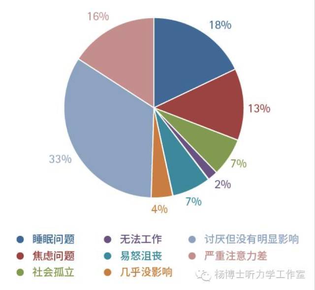 生活中總有些東西值得分享 耳朵嗡嗡響是怎么回事? 不同的患者聽到的耳鳴聲音也是多樣化的,有的像蟬鳴的嗡嗡聲,有的是像刮風的嘩嘩聲,有的很規律,有的則是變來變去。因此,臨床中耳鳴也存在著比較大的個體差異。盡管有研究顯示,一些患者并不覺得耳鳴帶來了什么負面影響,但對于多數患者而言,他們深受折磨。2014年一份美國耳鳴協會(ATA)的會員調查評估報告,對1100多人進行了調查,采用評分制,1分 =幾乎不影響生活,10分 =嚴重影響生活,評分在5分以上的占到調查總人數的54%。被調查患者對耳鳴主觀評價的占比前三名分別是:討厭但沒有明顯影響到生活(33%),造成睡眠問題(18%),容易產生焦慮(16%)