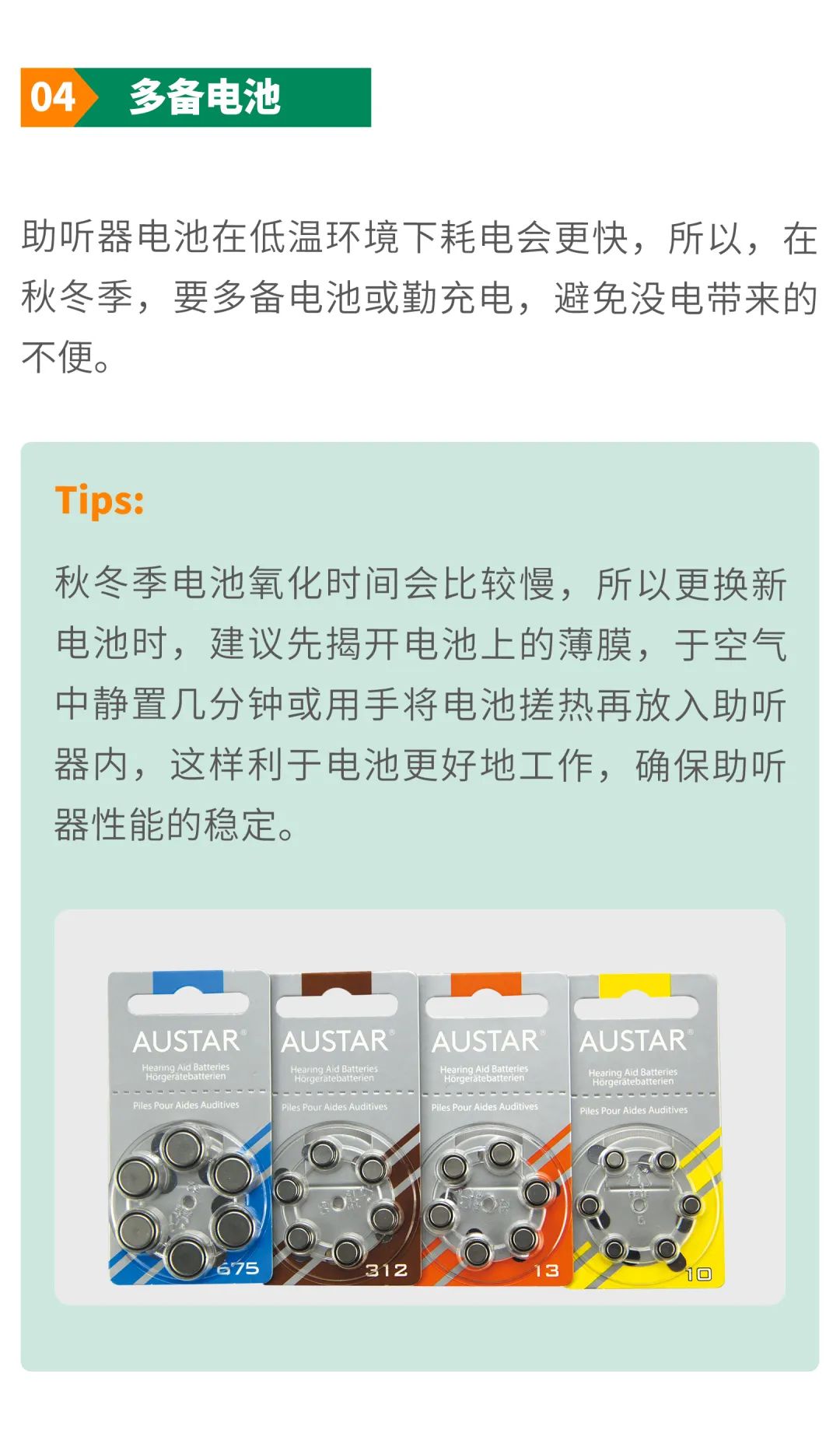 助聽器電池在低溫環(huán)境下耗電會更快,所以,在秋冬季要多備電池或勤充電,避免沒電帶來的不便。