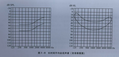2.長時間平均會話聲譜( LTASS ):正常人的語聲在強度和頻率上都有一定的范圍,記錄一段長時間言語會話,分析其強度變化范圍及其與頻率的關系,稱為正常人長時間平均會話聲譜( LTASS )。如果對語聲的測量是以 dB SPL為單位,則表現為左圖所示;若將 SPL換成 HL,則表現為香蕉狀區域,如右圖所示。整個言語會話強度變動范圍為30dB,在低頻區域強度約40—70 dB SPL,在高頻區域強度約25—55 dB SPL。