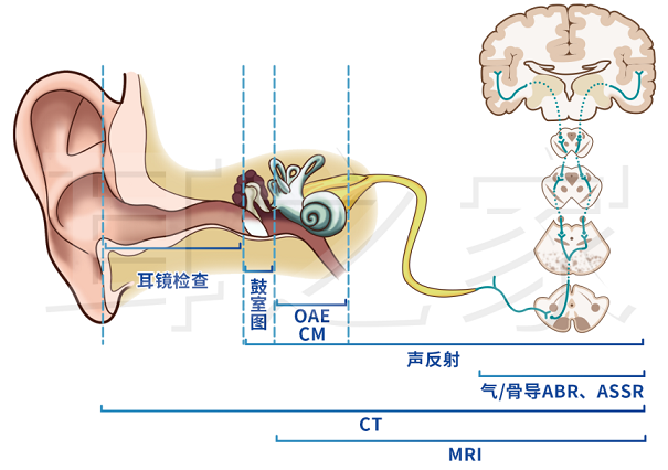 引言 聽力檢查是診斷聽力損失的重要手段,但項目可不只一兩項。特別是嬰幼兒、兒童做了一堆檢查,到底是在檢查耳朵哪個部位呢?今天我們就來講講。 耳內窺鏡檢查 耳內窺鏡檢查可直接觀察外耳道和鼓膜的結構,可以發現耵聹栓塞、外耳道炎、鼓膜穿孔或其他外耳和中耳的異常。