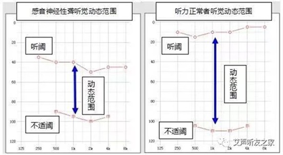 范圍變窄了,以下圖為例。上邊的陰影部分,代表聽不到的聲音范圍,下邊的陰影部分是會(huì)感覺不舒服的聲音范圍,中間空白部分就聽覺動(dòng)態(tài)范圍。一般聽力正常的人能夠聽到的最小聲音在0分貝-25分貝之間,最大聲音可以忍受到120分貝。而聽力受損的人能夠聽到的最小聲音,可能在30分貝,60分貝,甚至80分貝,能夠忍受的最大聲音卻可能還沒有120分貝。所以聽力下降的朋友,對(duì)大聲的忍受能力并沒有比普通人高。且常常是從聽不見的安靜環(huán)境,突然到能聽見的大聲環(huán)境,就像普通人從安靜的環(huán)境突然到嘈雜的車間,會(huì)覺得非常的吵,都是一樣的。另一方面,是因?yàn)橹卣瘢锹犃p失后的一種常見現(xiàn)象,多見于感音神經(jīng)性聾患者。對(duì)于正常聽力的朋友,“我說(shuō)話的音量提高1倍,聽感覺也就增加了一倍;我聲音提高了10倍、100倍,他們聽感覺也是相應(yīng)地大了10倍、100倍。但對(duì)于有重振的朋友,我說(shuō)話的聲音加1倍,他們的感覺往往會(huì)加大5倍、10倍、20倍、50倍甚至更多。所以同樣的音量,他們聽起來(lái)其實(shí)比聽力正常的朋友大得多,自然也更怕吵。聽損越嚴(yán)重的人,能夠聽到的聲音起始點(diǎn)越高,聽覺動(dòng)態(tài)范圍越窄,所以也就越怕吵。比如我曾經(jīng)遇到的一位王叔叔,動(dòng)態(tài)范圍就非常窄,有些頻率剛聽到聲音,就要到不能夠忍受的程度了。上邊的圖就是王叔叔的聽力圖,可以看出聽閾到不舒適閾的距離非常窄。所以,給他配助聽器時(shí),我們會(huì)把聲音壓縮放大到僅有的動(dòng)態(tài)范圍內(nèi),保證他佩戴助聽器后能聽到,聽清,聽懂。助聽器因?yàn)榉糯笤恚瑫?huì)把周圍的聲音收集后放大,小聲音經(jīng)過放大補(bǔ)償后就會(huì)聽到之前聽不到的聲音,大聲經(jīng)過放大后,如果驗(yàn)配的不合適,就會(huì)超過不舒適閾,戴上助聽器會(huì)有吵的感受,這種情況對(duì)驗(yàn)配師的挑戰(zhàn)會(huì)比較高,所以一定不要隨意去驗(yàn)配和選擇助聽器,要做仔細(xì)的氣導(dǎo)、骨導(dǎo)、不舒適閾的檢查,尤其是不舒適閾,有的聽力中心,會(huì)不測(cè)試這一項(xiàng),一定要留心觀察,有沒有測(cè),后期的試戴、評(píng)估與調(diào)試等也要更加仔細(xì)些,才能達(dá)到理想的效果,從而提高生活質(zhì)量。