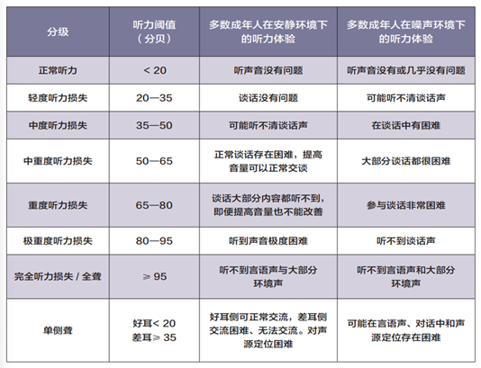 聽力下降并不是一個可以被忽視的問題。對65歲以上的老年人來說,聽力下降的老年人發生交通事故的風險明顯增加。同時,聽覺功能的損失會使老年人接收外界的信息和受到的刺激減少,時間長了會出現社交障礙,促發孤獨感及挫折感,甚至引起抑郁等精神心理問題。 有明確的統計證明,聽力下降的老年人精神心理疾病發生率明顯高于一般老人,且發生率與聽力障礙程度呈正相關。 亦有研究者認為,聽力障礙與早期認知減退及阿爾茲海默病有關。 老年人可依據下面這張表,給聽力損失評個級,看看自己究竟到了哪一步。